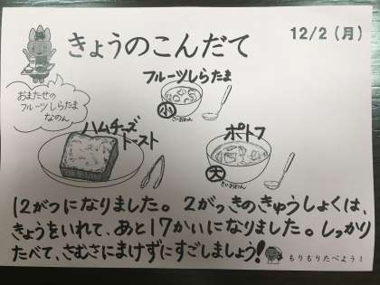 実は、私の朝食は毎日、ハムチーズトーストです…。チーズはカロリーが高いから、やめようかなと思いつつ、やめられません。今日の給食のハムチーズトーストは、タマネギも入っているので、ピザトーストに近いですね。
