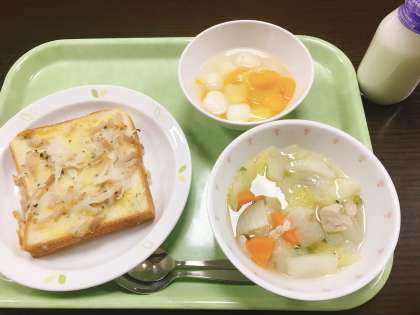 今日は、ハムチーズトースト、ポトフ、フルーツ白玉、牛乳です。