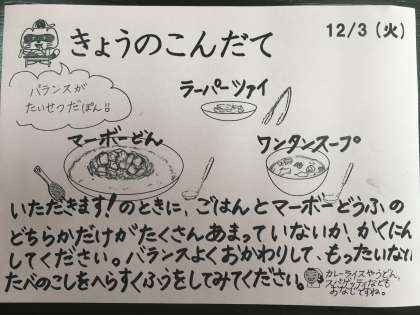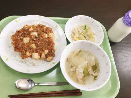 今日は、麻婆丼、ワンタンスープ、辣白菜、牛乳です。