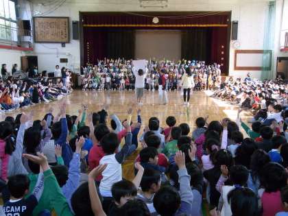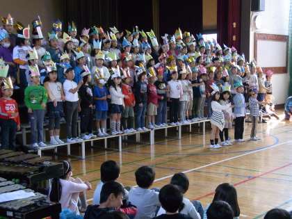 今日は朝会のときに1年生を迎える会を実施しました。代表委員会の児童が仕切ってくれます。音楽委員会の児童が音楽を演奏してくれます。児童の手による迎える会です。6年生に手をつながれ、1年生が入場してきました。すっかり学校にもなじんで、ニコニコ笑顔です。山野小学校クイズをやったり、歌を歌ったり、最後は1年生の歌で終わりました。