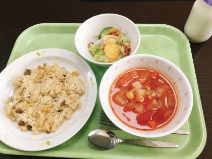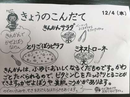 今日は、鶏ごぼうピラフ、きんかんサラダ、ミネステローネ、牛乳です。