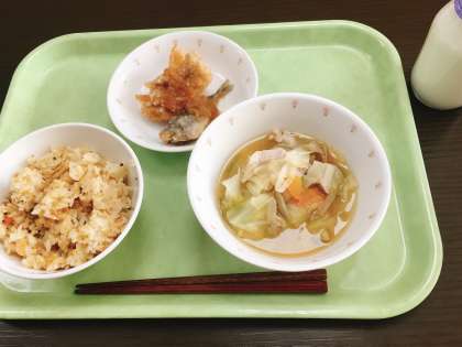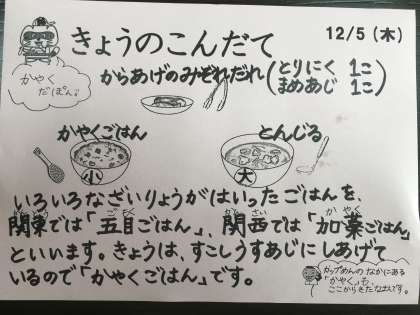 今日は、かやくごはん、から揚げみぞれだれ、豚汁、牛乳です。