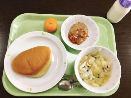 今日は、あしたばとびうおバーガー、ムロアジだし香るスープ、みかん、牛乳です。