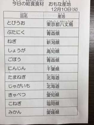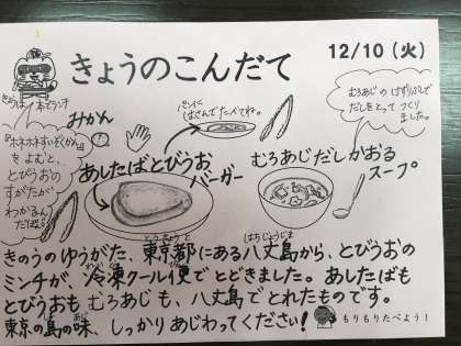 あしたば入りのパン、とびうおのバーガー、ムロアジのだしが八丈島産の食品を使った八丈島献立です。八丈島のキョンは献立に入っていません。と、言っても若い人には分からないですね。