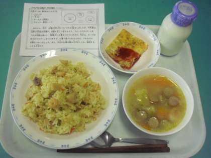パエリア、牛乳、チーズ入り卵焼き、ウインナー野菜スープ