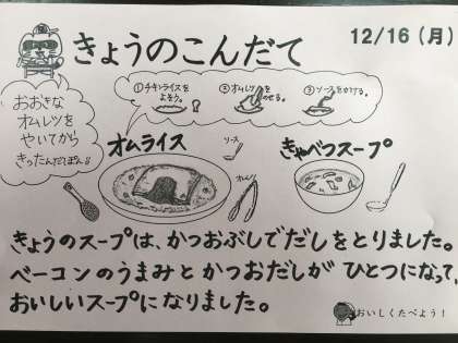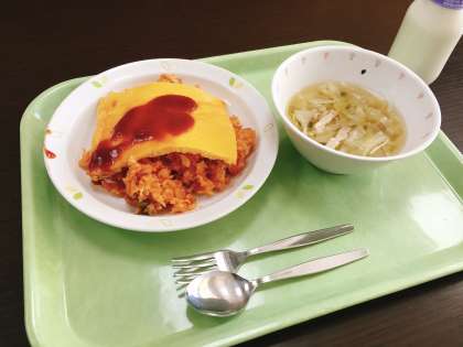 今日は、オムライス、きゃべつスープ、牛乳です。