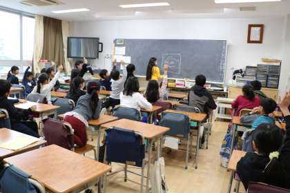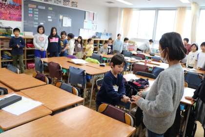 1年生は、もうどこの教室に行けばいいか分かっているので一人でも移動できるのですが、お兄さんお姉さんを待っています。