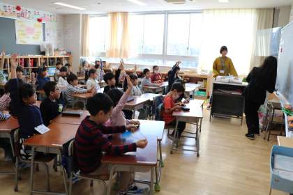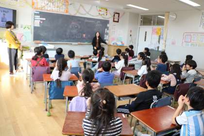 1年生の外国語活動の様子です。いろいろなアクティビティーやALTの先生とのコミュニケーションを通して音声の違いや、基本的な表現に慣れ親しみます。