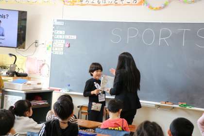 ジェスチャーゲームでは、前に出た友だちのジェスチャーから何のスポーツかを当てます。先生が「誰か前に出てジェスチャーに協力してください。」と(英語で)声をかけると、たくさん立候補の手が挙がります。さあ、このカードのスポーツです。何のスポーツでしょう?そして英語で何というのでしょう?