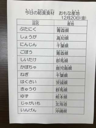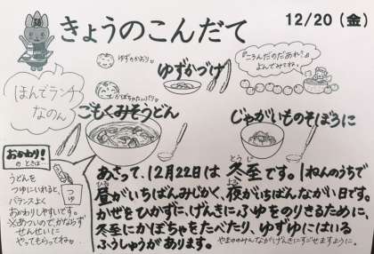 給食では、野菜の和え物にゆずが入っています。冬至つながりで言えば、五目味噌うどんには、かぼちゃが使われています。
