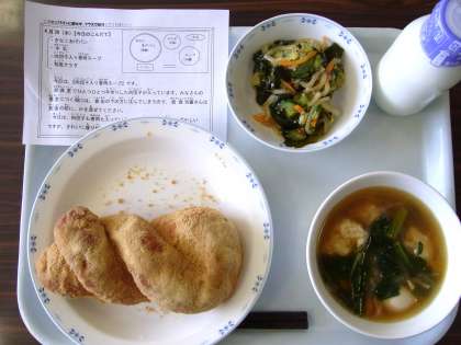 きなこあげパン、牛乳、肉団子入り春雨スープ、和風サラダ