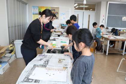 3年生「紙版画」刷りの授業の様子です。図工専科の先生と担任の先生に手伝っていただきながらローラーでインクをつけ、ばれんで均一に圧力をかけ、紙をはがすと・・・子どもたちの目が輝きます。自分が作った版がインクをつけるとまたこんなにも味わい深いものに変身するという驚きと喜びの表情です。