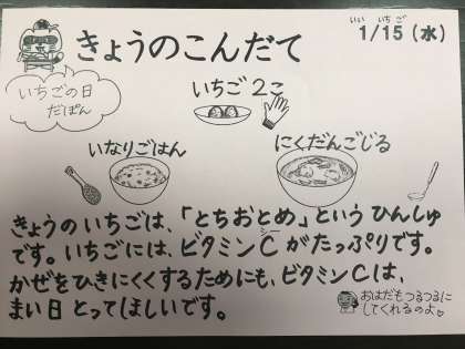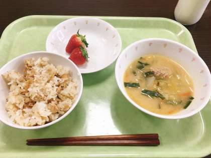 今日は、いなりごはん、肉団子汁、いちご、牛乳です。