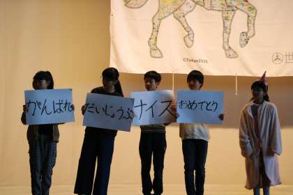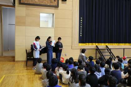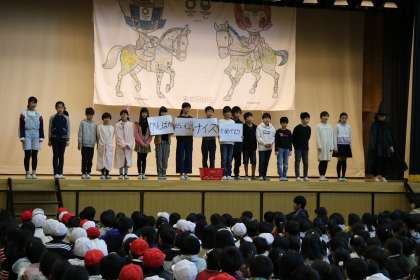 劇の他に、毎朝放送で「今日のふわふわ言葉」を一つ提案しする放送担当の代表委員もいます。ふわふわ言葉は一つではないですが、意識して生活するきっかけになります。また、ふわふわ言葉の歌を、アニメソングをベースに替え歌にして作った歌担当の代表委員もいます。代表委員会の子どもたちが、いろいろな方法で山野小学校にふわふわ言葉を増やす取り組みを頑張っています。
