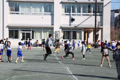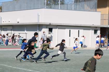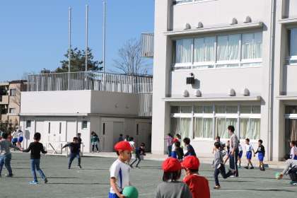 休み時間の校庭の様子です。今日の中休みは低学年の外遊びの時間でした。山野小学校の休み時間は、子どもと教師が一緒に遊ぶ「共遊び」を奨励しています。遊びを通して、授業中だけでは分からない、一人一人の良いところに気付いたり、ほんの小さな変化や情報も、この共遊びの中から得られればと思っています。