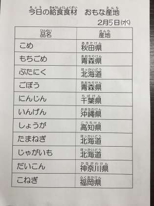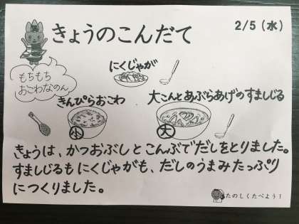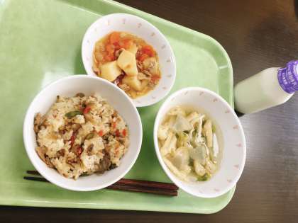 今日は、きんぴらおこわ、肉じゃが、大根と油揚げのすまし汁、牛乳です。