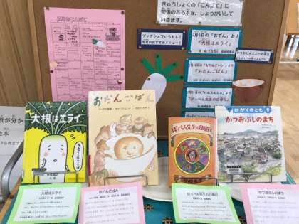 2月も本でランチが継続しています。10日の給食は、おだんごパンにちなんだ献立ですが、何とY先生が作った人形が展示コーナーに登場しました。子どもたちの注目を集めています。