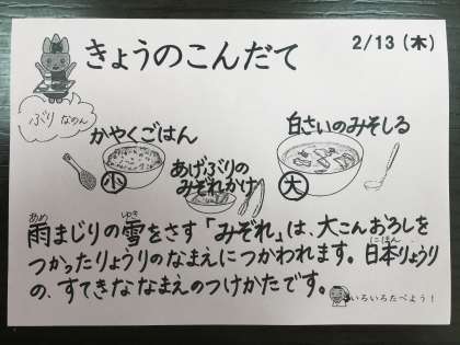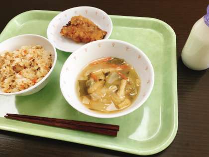 今日は、かやくごはん、揚げ鰤のみぞれかけ、白菜のみそ汁、牛乳です。