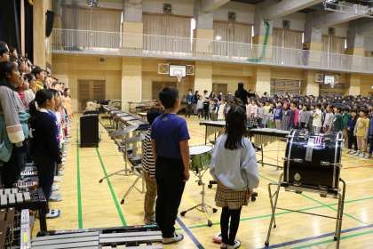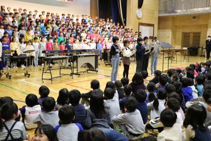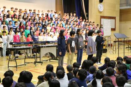 4年生と5年生のミュージックフェスタ実行委員が司会を務めました。司会が鳴らすトーンチャイムの音が開演の合図です。
