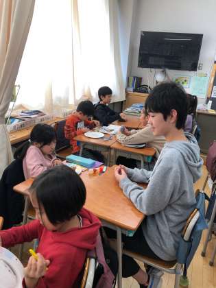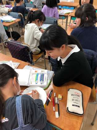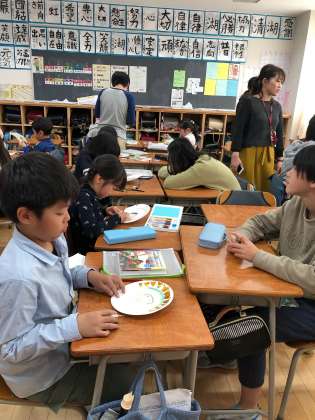 1年生が、六年生にプレゼントするために、似顔絵を描いています。1年生は大変緊張した様子です。6年生は、緊張をほぐそうと、色をアドバイスしたり描き方のコツを教えたり、なごやかなムードの授業です。