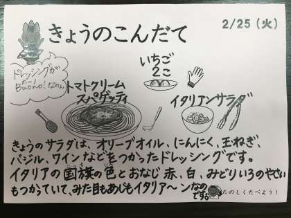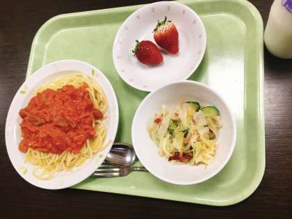 今日は、トマトクリームスパゲッティ、イタリアンサラダ、いちご、牛乳です。