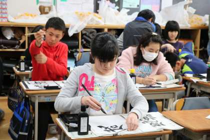 真剣に自分の字と向き合う6年生。われらがリーダー6年生のこのような立派な姿に