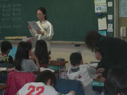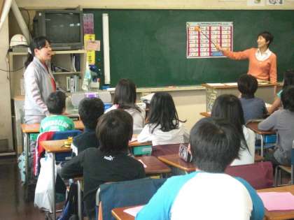 担任の遠藤先生と英語支援員の近藤さんで、”英語に親しむ+α”となる授業を創っています。