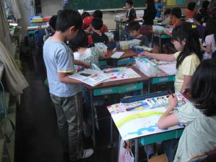 「絵の具と水のハーモニー」という題材で、一人一人が芸術家気取りです。