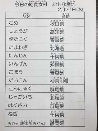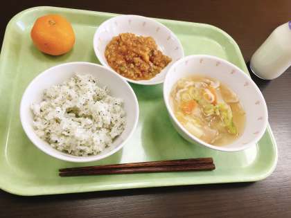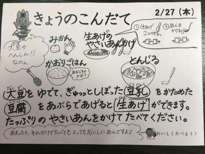 今日は、かおりごはん、生揚げの野菜あんかけ、豚汁、みかんです。