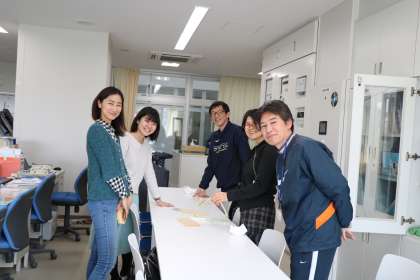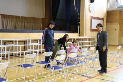 体育館で卒業式の椅子の配置を考えている6年生の先生たち。