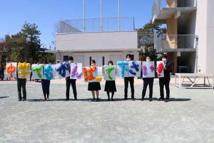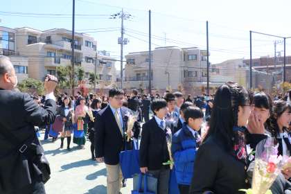 卒業生が笑顔で花道を通り抜け、山野小学校を巣立っていきました。
