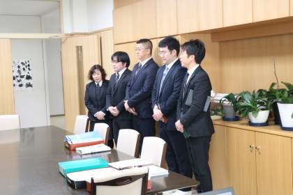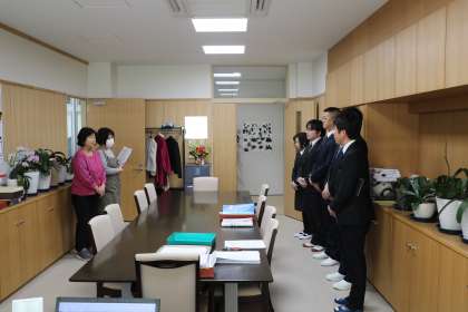 写真は4月1日、給食調理社員の皆さんが校長室を訪ねてくださった様子です。他にも山野小学校の給食を作ってくださっている人はたくさん、総勢20人ほどで調理をしています。