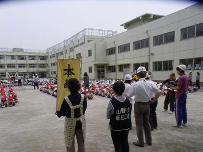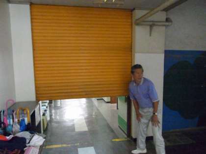 5月の避難訓練がありました。第1理科室の出火を想定し、防火シャッターが閉まった状態での訓練です。訓練の合図とともに、主事さんにお願いし、安全を確認してシャッターが閉まりました。子どもたちは、整然と避難できました。学校では、さまざまな状況を設定し、今後も月に1回避難訓練を実施していきます。