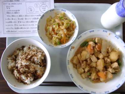 今日の献立:おかかご飯・牛乳・ジャガイモのそぼろ煮・野菜のレモン醤油かけ