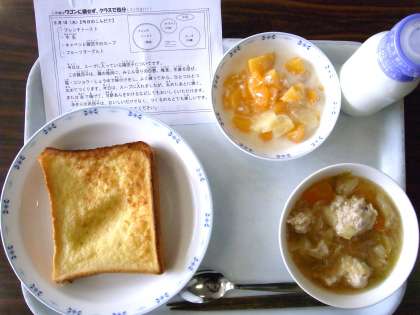 フレンチトースト・牛乳・キャベツととり団子のスープ・フルーツヨーグルト