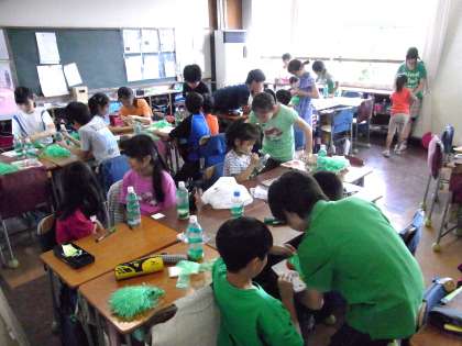 4時間目に、応援グッズ作りの時間がありました。きょうだい学年で上級生が下級生に作り方を教えます。自分たちの色の勝利がかかっているので、教え方も真剣です。今年初めて教える側になった4年生も、3年生に上手に教えられたと笑顔でした。異学年交流で、子どもたちの心が育っているなあと実感しました。早く終わったところは、さっそく応援グッズを使って練習をしていました。