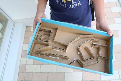 動画を作り終えたところで…なんと!「学童で作ったの」と作品を見せに来てくれた3年生がいました。まだボンドがしっかり乾いていない、できたてほやほやの「ビー玉コロコロ」で遊ばせてもらいました。コースの中に、さらにミニコースを作ったところが工夫したところなのだそうです。