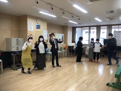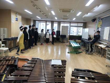 音楽室で音楽の動画を作成している様子です。1人でやったり、2人でやったり、2人以上でやったり、動画を見ながらご家庭で工夫できる内容になっています。他の学年の先生まで駆り出され、あれこれ相談しながら、とても楽しそうな様子でした。