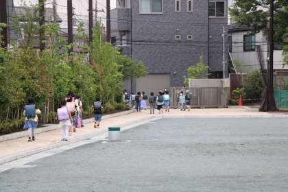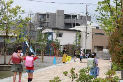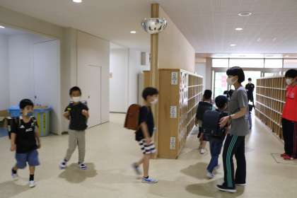 午前中の学年が下校します。下校時も密にならないよう、担任や他学年の先生が見守っています。
