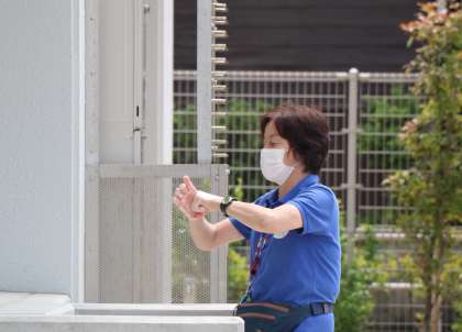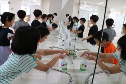 遊んだあとは手洗い・うがいをしっかりします。先生も外の水道でしっかり手洗い。お手本になる洗い方です。
