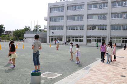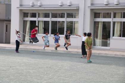 休み時間の様子です。今日は初めて、第2グランドが使えました。フェンスが高くなっただけでなく、でこぼこだった土がきれいに、そして水はけのよい土になりました。長縄やボール投げ、じゃんけんグリコ、おにごっこ…様々な遊びを先生や友達と楽しんでいました。