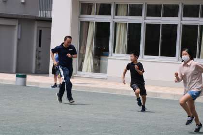 見通しが良い校庭のどこに鬼の先生がいるか?先生は呼吸を整えながらどうやって捕まえようか考えているはずです。「きっとあそこから出てくるから、逆にこっちに逃げよう」と相談する6年生。6年生の鬼ごっこは、体力と頭脳両方が必要です。