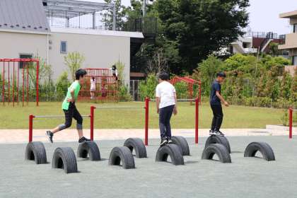 6年生は久しぶりの校庭遊びです。山野小学校は先生たちに「共遊び」を推奨しています。長縄や遊具、ボールなど、先生といっしょに楽しんでいる子もいます。