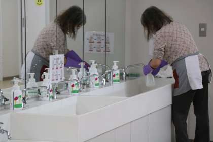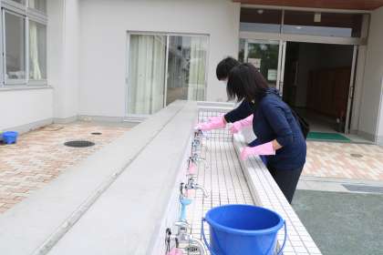 午前中の子達が下校した後、消毒作業です。教室の机、スイッチ、階段の手すり、トイレ、水道など、先生、主事さんと手分けして消毒をします。アルコール消毒スプレーも届きました。各教室に1本置きます。