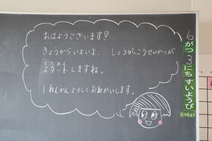 今日、午前中は1年生・6年生Bグループ、午後は4年生Bグループの登校日でした。担任の先生たちも楽しみにしていました。消毒・清掃はもちろん十分に、そして黒板には、温かいメッセージが書かれています。