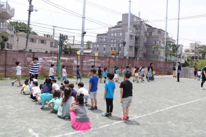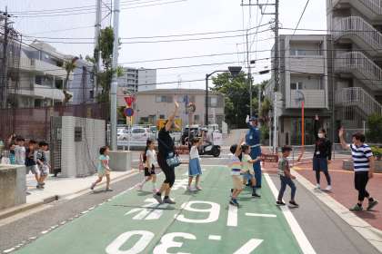 第2グラウンドから校舎に戻るときには、道路を渡ります。今日は警備さんがいる時間でした。車は一日通行止めになっていますが、自転車や、通行される方に気を付けて、自分の目で確かめて渡ります。