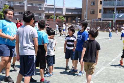 2時間目と3時間目の間は、お楽しみの休み時間です。今日は1年生、初めて第2グラウンドで遊びます。6年生も一緒に遊ぼうと来てくれました。