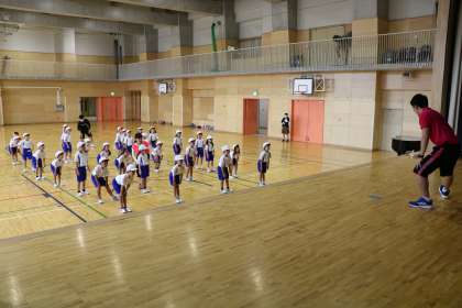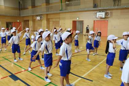 クーラーの効いた体育館で、体育の学習をしている1年生です。例年5月のスポーツフェスタでやる準備体操(ダンスのような楽しいものです)をやっているところです。