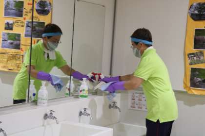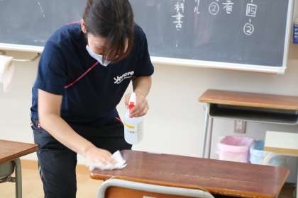 午前中のグループが下校した後は、教職員総出で消毒作業です。午後から登校する学年の先生たちは、お昼ご飯を食べるのもそこそこに、教室をきれいにして、子どもたちが健康で安全に、気持ちよく学習できるよう準備をしています。