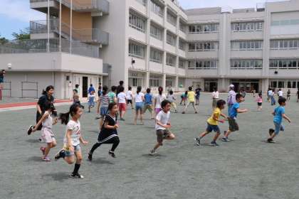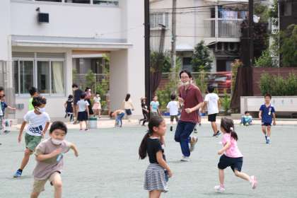 鬼ごっこ、バナナ鬼、遊具で遊ぶ子、竹馬、一輪車で遊ぶ子様々です。